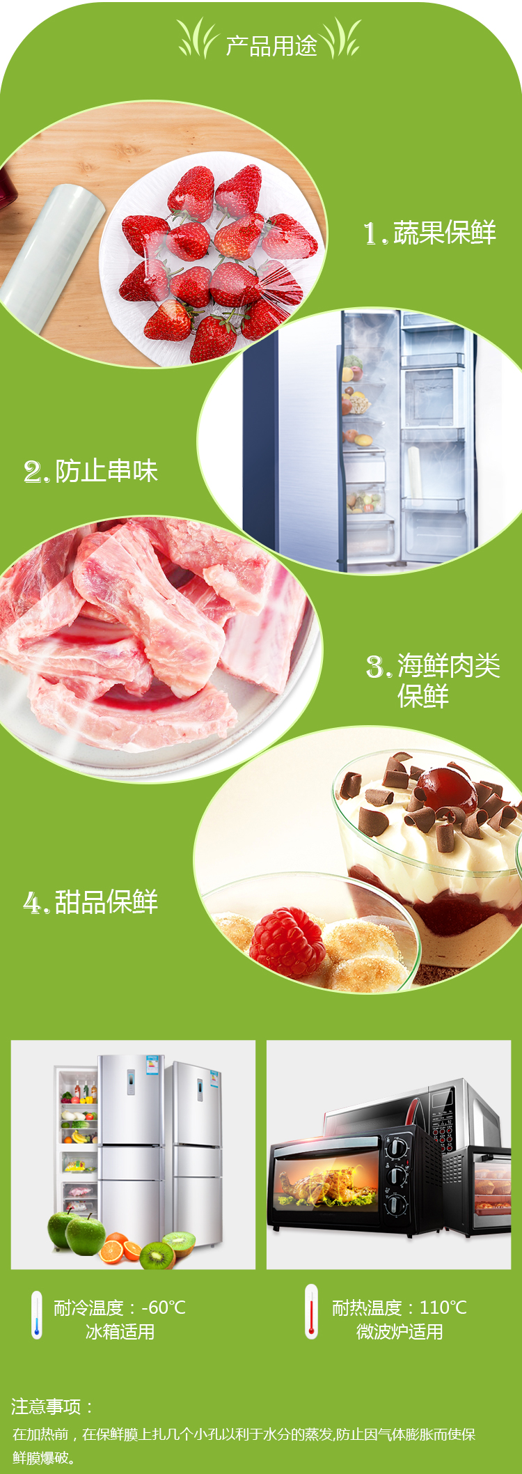 主要优点:1.保持食品新鲜,PE材质更安全,易于切割,可用于微波炉;